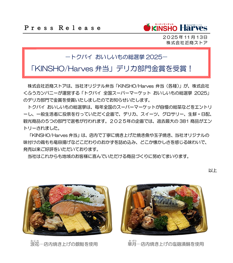 ―トクバイ おいしいもの総選挙2025―「KINSHO/Harves弁当」デリカ部門金賞を受賞!