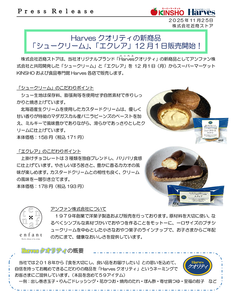 Harvesクオリティの新商品「シュークリーム」、「エクレア」12月1日販売開始!
